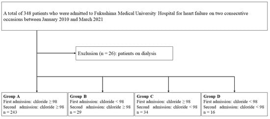 This study was an observational study. A patient flowchart is shown in Figure 1. A total of 348 patients who were admitted to Fukushima Medical University Hospital for HF on two occasions between January 2010 and March 2021 were enrolled. The diagnosis of HF was made by the attending cardiologists based on the HF guidelines [7,21,22,23,24]. Among them, a total of 26 patients on dialysis were excluded. The remaining 322 patients were included in the analysis. Hypochloremia was defined as levels of serum chloride of <98 mmol/L, in accordance with a previous study focusing on hypochloremia in patients with HF [13]. The patients were divided into four groups based on the changes in the presence/absence of hypochloremia: Group A (n = 243, 75.4%), those without hypochloremia at the first and the second hospitalizations; Group B (n = 29, 9.0%), those with hypochloremia at the first hospitalization and without hypochloremia at the second hospitalization; Group C (n = 34, 10.6%), those without hypochloremia at the first hospitalization and with hypochloremia at the second hospitalization; and Group D (n = 16, 5.0%), those with hypochloremia at the first and the second hospitalizations. Groups B and C were defined as transient hypochloremia. Group D was defined as persistent hypochloremia. The patient characteristics and prognoses after the second discharge were compared among the four groups. The patient characteristics included demographic data at discharge after the first hospitalization and the laboratory data at the first and second hospitalizations. The laboratory data were collected at hospital discharge. The type of HF was classified as HF with reduced, mildly reduced, and preserved ejection fraction (those with left ventricular ejection fraction of <40%, 40–49%, and ≥50%, respectively). Ischemic HF was defined as HF caused mainly by coronary artery disease as adjudicated by the attending physicians. The primary endpoints were all-cause death and cardiac death after the second discharge. Cardiac death was defined as death due to worsening HF, acute coronary syndrome, or ventricular fibrillation [25,26,27].