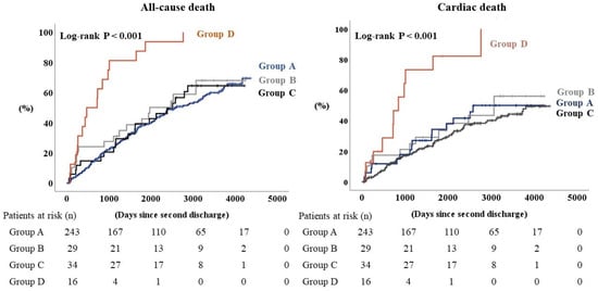 During the follow-up period of a median 1694 days, a total of 171 all-cause deaths, including 119 cardiac deaths, were identified. All of the other patients were censored. The Kaplan–Meier analysis showed that both the all-cause and the cardiac deaths were highest in Group D, in which all the patients died during the follow-up period (Figure 2, log-rank p < 0.001, respectively). In the Cox proportional hazards analysis (Table 2), Group D had a hazard ratio of 3.490 for all-cause death and 3.919 for cardiac death after adjustment for age, sex, body mass index, atrial fibrillation, and serum sodium level at the second HF hospitalization, compared with Group A as a reference. There was no significant difference in Group B or Group C, compared to Group A.