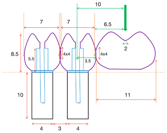 Most authors do not perform tests on structures of this kind, but rather on bars of different shapes [20,21]. On the other hand, we applied occlusal loading to the center of the occlusal surface of the cantilever (a molar), 10 mm from the center of the most distal implant [22] (Figure 6).