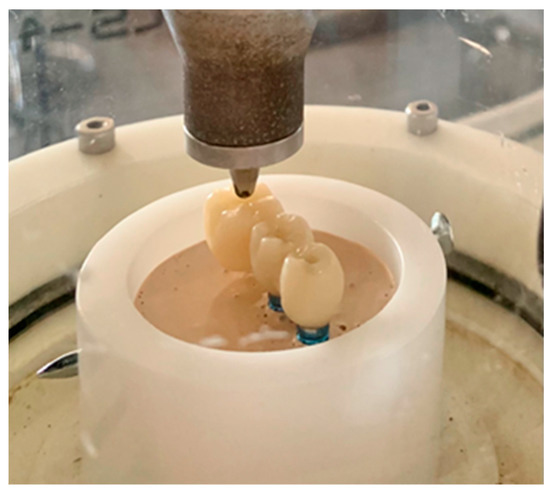 Study specimen mounted in the chewing simulator during fatigue testing.