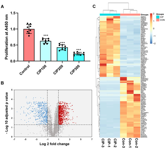 Identification of DEPs in CIP-stimulated VSMCs and cluster analysis. (A) CCK-8 results of VSMCs after CIP stimulation; (B) Volcano plot of DEPs; (C) Cluster analysis of the top 100 DEPs (50 upregulated, 50 downregulated). The symbols (***) represents p < 0.001 vs. control.