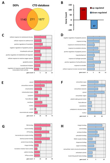 T Bar charts of the GO analysis results including BP, CC, and MF terms for 211 common genes. (A) Venn diagram showing the overlap of genes between DEPs and CTD-based AAD-related genes. (B) Bar charts of the up- and downregulated common molecules between DEPs and CTD-based AAD-related genes. (C,D) Enriched terms in the BP category for (C) upregulated and (D) downregulated common genes. (E,F) Enriched terms in the CC category for (E) up-regulated and (F) downregulated common genes. (G,H) Enriched items in the MF category for (G) upregulated and (H) downregulated common genes.