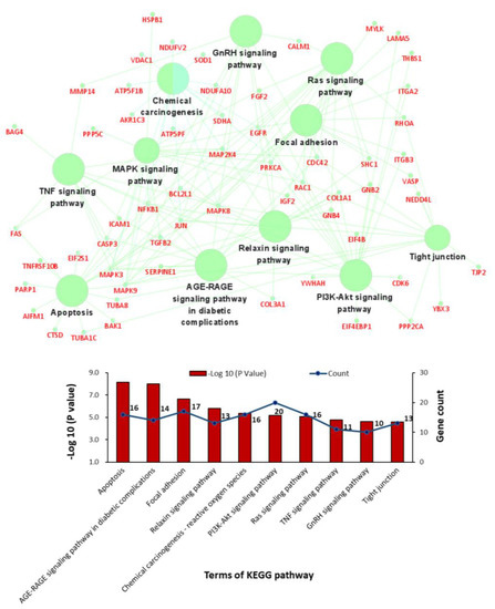 GO term and KEGG pathway enrichment analyses were conducted to analyse the biological functions and pathways involving those 211 overlapping DEGs. Regarding BPs, the cellular response to mechanical stimulus and cellular response to cadmium ion BP terms were significantly enriched for the upregulated DEGs, and the regulation of apoptosis term was significantly enriched for both the upregulated and downregulated DEGs (Figure 3C,D). In the cellular component (CC) category, the cytosol, extracellular space, mitochondrion, and focal adhesion GO terms showed significant changes (Figure 3E,F). In the molecular function (MF) category, RNA binding, enzyme binding and ATP binding were enriched for the upregulated DEGs, while integrin binding, actin binding and protease binding were enriched for the downregulated DEGs (Figure 3G,H). In addition, KEGG analysis results showed that the overlapping DEGs were significantly enriched in apoptosis, the AGE-RAGE signalling pathway, focal adhesion, the relaxin signalling pathway, reactive oxygen species, the PI3K-Akt signalling pathway, the Ras signalling pathway, the TNF signalling pathway, the GnRH signalling pathway, and tight junctions (Figure 4).