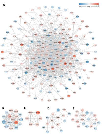The PPI network was constructed using the STRING database (http://string-db.org/, accessed on 3 July 2022) [21]. The overlapping DEPs were analysed with the STRING database with a confidence score fixed at 0.4 (medium confidence). Then, Cytoscape software (version 3.9.1, https://cytoscape.org/, accessed on 3 July 2022) was used to construct and visualize the PPI network of the overlapping DEPs [22]. Functional modules were identified with the Cytoscape plugin MCODE using the default parameters (degree cut-off = 2, node score cut-off = 0.2, K-core = 2 and max depth = 100) [23]. Then, another Cytoscape plugin, cytoHubba, was used to identify the hub genes [24]. In cytoHubba, several common algorithms (MCC, MNC, Degree, EPC, Closeness, Radiality and Stress) were used to evaluate and screen the hub genes.