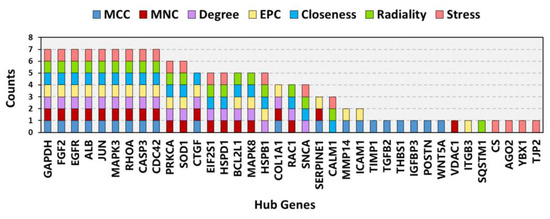 The PPI network of the overlapping DEGs with combined scores > 0.4 was obtained from the STRING database and then visualized using Cytoscape software (https://cytoscape.org/, accessed on 3 July 2022). This PPI network contained 200 nodes and 1207 edges (Figure 5A). The top four closely connected gene modules were identified with MCODE, and the results are presented in Figure 5B–E. With another plugin of Cytoscape, cytoHubba, we determined the top 20 hub genes via seven main algorithms, and the results are shown as stacked bar plots (Figure 6). Among these genes, GAPDH, FGF2, EGFR, ALB, JUN, MAPK3, RHOA, CASP3, and CDC42 were identified as significant by all seven algorithms.