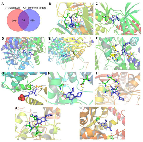 CIP target prediction and molecular docking. (A) Venn diagram showing the overlapping components among the predicted CIP targets and CTD-based AAD-related genes. (B–K) Molecular docking results for AOC3, CDK5R1, GPD1L, HDAC6, LDHB, MYO5A, PARP1, RAC1, SDHA, and WARS1.