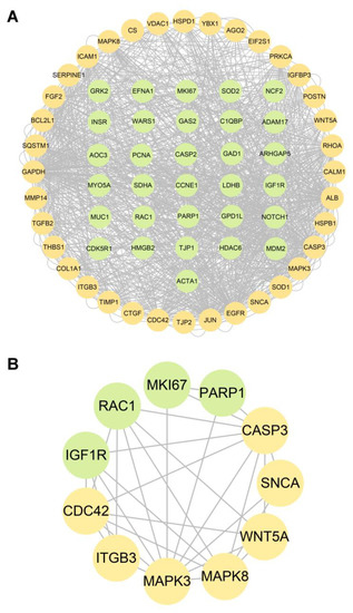 PPI network between AAD-related CIP targets and hub genes of CIP-stimulated DEPs. (A) PPI network. (B) Gene cluster module. Green nodes: AAD-related CIP targets. Yellow nodes: hub genes among the genes encoding CIP-stimulated DEPs.
