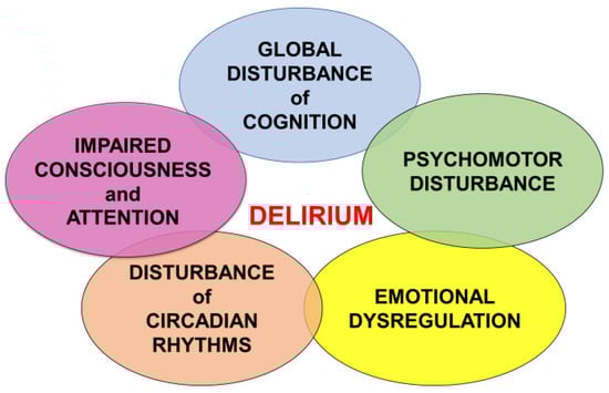 Delirium is the most common neuropsychiatric syndrome encountered by clinicians dealing with older adults and the medically ill [15]. The clinical features of delirium include five core domains: cognitive deficits, attentional deficits, circadian rhythm dysregulation, emotional dysregulation, and alterations in psychomotor functioning, which are characterized by the acute onset of symptoms with a fluctuating course [16] (Figure 1).