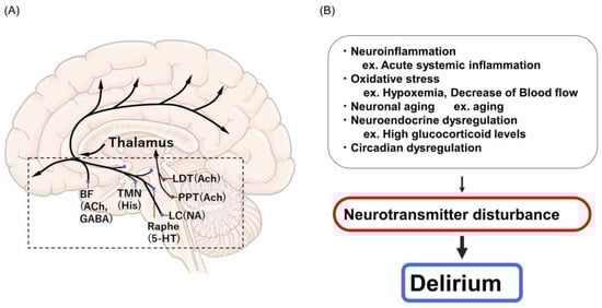 Despite its clinical impact, the pathophysiological mechanisms underlying delirium have not yet been elucidated in detail [17]. Central cholinergic deficiency [18], excess dopamine, inflammation, chronic stress, hypoxemia, impaired blood flow and tissue perfusion, and impaired metabolism (hyponatremia, hypernatremia, and hypoglycemia) have been proposed as the pathophysiological mechanisms responsible for delirium [19,20]. Anatomically, cholinergic pathways have widespread interconnections in the brain, and acetylcholine plays an extensive role in sensory and cognitive inputs; therefore, irregularities in these brain functions cause the core symptoms of delirium. The reduced availability of acetylcholine, the excess release of dopamine, norepinephrine, and glutamine, and changes in serotonin, histamine, and gamma-aminobutyric acid levels in the brain are associated with delirium and interact with other important neurotransmitter of consciousness and arousal systems (Figure 2A,B).