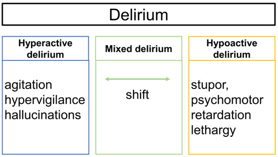 Delirium is classified into three motor subtypes: hyperactive, hypoactive, and mixed delirium [34]. Hyperactive delirium is characterized by agitation, hypervigilance, and hallucinations, whereas hypoactive delirium is characterized by stupor, psychomotor retardation, and lethargy. In mixed delirium, the patient shifts between hyperactive and hypoactive delirium.