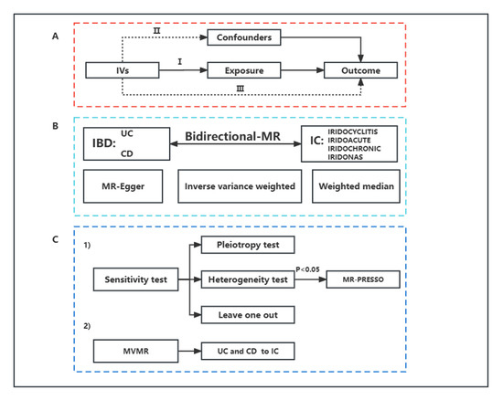 An overview of the study design. (A) Illustration of MR. MR is based on three principal assumptions: (Ⅰ) the IVs are associated with the exposure; (Ⅱ). the IVs are not associated with confounders; (Ⅲ). the IVs influence the outcome only through no other ways but exposure. (B) Illustration of bidirectional MR. When IBD was set as exposure, IC was the outcome. When IC was set as exposure, IBD was the outcome. Three MR methods were performed to assess the causal estimations between IBD and IC, including inverse-variance weighted, MR Egger, and weighted median, whereas the first was used as the main analysis. IBD data included UC and CD. IC data included IRIDOCYCLITIS (IC as a whole), IRIDOACUTE (acute and subacute IC), IRIDOCHRONIC (chronic IC), IRIDONAS (other and unspecified IC). (C) Illustration of sensitivity analysis and MVMR. (1): MR-Egger intercept test was used to assess pleiotropy. Cochran’s Q test was used to detect heterogeneity. MR-PRESSO test was used to detect and remove outliers when heterogeneity is found. Leave-one-out analysis was used to check the potential influence of the IVs on MR estimates. (2): To avoid the confounders between UC and CD, a further MVMR analysis was performed. MR: Mendelian randomization; IVs: instrumental variables; IBD: Inflammatory bowel disease; UC: ulcerative colitis; CD: Crohn’s disease; IC: iridocyclitis; MR-PRESSO: MR Pleiotropy RESidual Sum and Outlier; MVMR: multivariable MR.