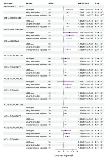 The MR estimates from the IVW method showed associations from IBD to IRIDOCYCLITIS (OR: 1.16, 95% CI: 1.11 to 1.22), IRIDOACUTE (OR: 1.16, 95% CI: 1.10 to 1.22), and IRIDOCHRONIC (OR: 1.24, 95% CI: 1.13 to 1.36), whereas no statistical significance from IBD to IRIDONAS was found. Results of the MR–Egger and weighted median methods were either consistent with the IVW method or had no statistical significance (Figure 2).