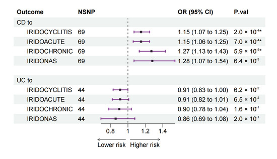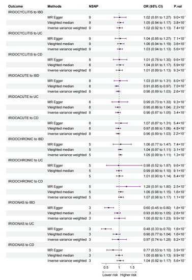 MR estimates from IC to IBD (including UC and CD) in bidirectional MR. MR: Mendelian randomization; IC: iridocyclitis; IBD: inflammatory bowel disease; UC: ulcerative colitis; CD: Crohn’s disease; NSNP: number of single nucleotide polymorphism; OR: odds ratio; CI: confidence interval; IRIDOCYCLITIS: IC as a whole; IRIDOACUTE: acute and subacute IC; IRIDOCHRONIC: chronic IC; IRIDONAS: other and unspecified IC. p-values < 0.0021 after Bonferroni correction were considered statistically significant.