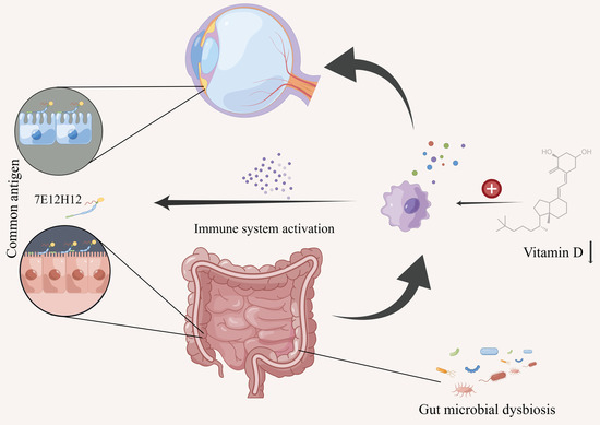 The possible mechanisms of iridocyclitis in inflammatory bowel disease. Different mechanisms, including shared peptide (common antigen), Vitamin D deficiency, and gut microbial dysbiosis could be involved. All of the mechanisms are immune-mediated, although other mechanisms may also exist.