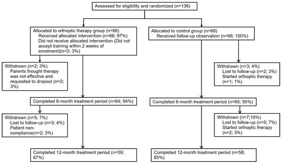 The eligible participants were informed about the study and provided consent prior to participating. Patients were randomly assigned to the orthoptic therapy group or the control group using a random number generator from SPSS software version 20.0 (IBM Corp., Armonk, NY, USA) with equal probability. The flowchart is shown in Figure 1.