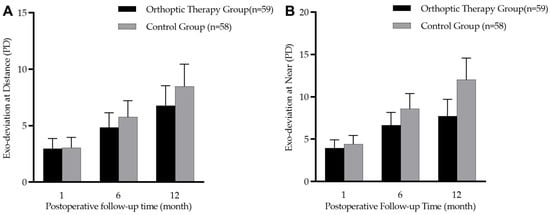 There was no significant difference in the amount of exodeviation between the two groups at baseline (at near: t = 0.67, p = 0.504; at distance: t = 0.13, p = 0.890). The comparison of three follow-up visits at 1, 6 and 12 months after the operation showed that patients in the two groups gradually drifted outward (at near: F = 38.91, p < 0.001; at distance: F = 33.77, p < 0.001). In the orthoptic therapy group and the control group, the mean exodeviation drift in PACT magnitude over 12 months was −3.9 ± 6.6 PD vs. −5.1 ± 6.2 PD at distance (t = 0.91, p = 0.364) and −3.8 ± 7.8 PD vs. −7.2 ± 7.9 PD at near (t = 2.26, p = 0.025). However, Figure 3 shows that there was no significant difference in exodeviation magnitude at near (F = 3.78, p = 0.055) or at distance (F = 0.92, p = 0.339) between the two groups during the three follow-up visits.
