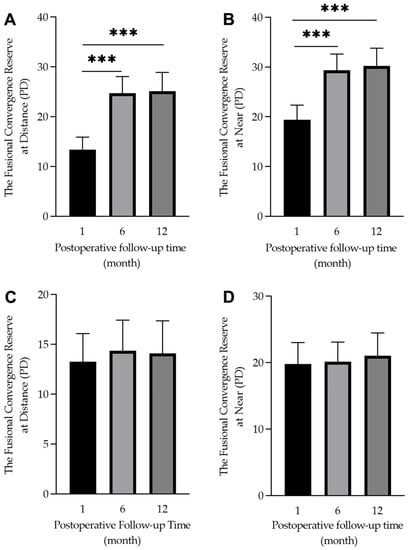 Box diagram showing the 1-, 6-, and 12-month postoperative fusional convergence reserve in the orthoptic therapy group (A,B) and the control group (C,D). There was a significant difference within the group (*** p < 0.001).