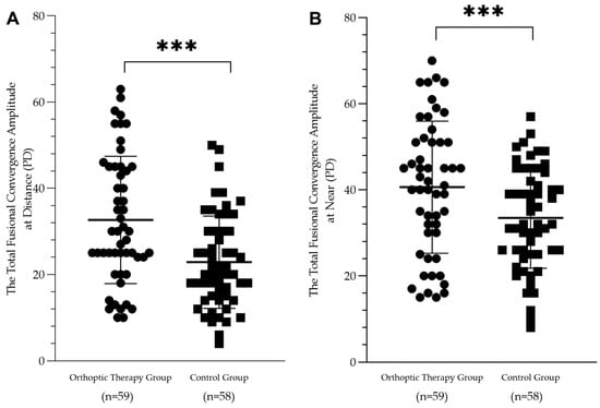 Scatterplots showing the postoperative 12-month total fusional convergence amplitude in the orthoptic therapy group and the control group at distance (A) and at near (B). There was a significant difference between the two groups (*** p < 0.001).