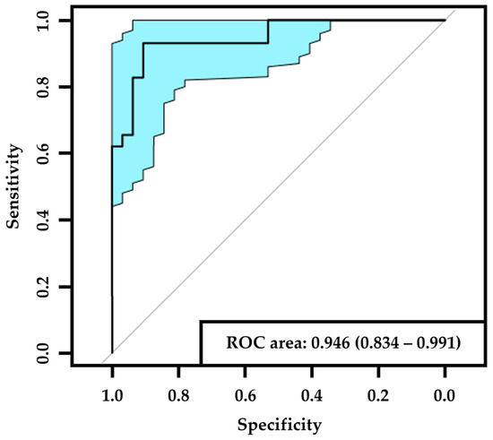 ROC (receiver operating characteristic) curve of PN+. The black line corresponds to the ROC curve and the blue area corresponds to the 95% confidence interval. List of abbreviations: PN+—peripheral neuropathy.