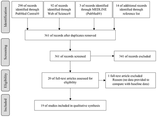 A total of 385 records were identified in the databases and 14 through the manual search. After removing duplicates (24 studies), 361 records were screened. After analysis of the title and abstract, 341 studies were excluded, and the remaining 20 records were evaluated by full text. One paper was excluded due to a lack of initial information available. Finally, 19 articles were finally included in this study (Figure 1).