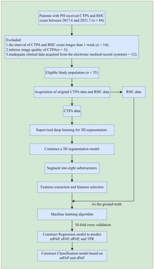 A non-invasive and effective method to diagnose PH is essential []. Although RHC is the most reliable way to establish the diagnosis of PH, as an invasive procedure, it might be delayed due to its potential complications []. In addition, this invasive procedure requires anesthesia so it is not suitable for early screening, and not all the medical institutions have the requirement for RHC inspection. As a non-invasive screening method, which has the advantage of providing more details in high-resolution 3D images [], computed tomography pulmonary angiography (CTPA) can be routinely used to observe the structure of pulmonary blood vessels, pulmonary parenchyma, and the heart to analyze or exclude possible PH causes. The morphological features in CTPA images serve as important references to assist clinicians in diagnosing PH. Assuming that the morphological features hidden in CTPA images are further excavated, we might be able to build a regression model to predict the PAP value based on CTPA images.