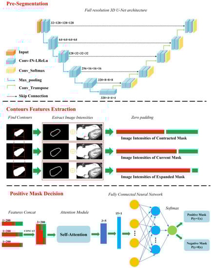 However, some of the outputs were larger or smaller than the ground-truth due to the low contrast between the segmentation part and the adjacent structures, which is mainly caused by the lack of contrast agent. To optimize these segmentation results, we proposed a framework to create a better mask for poor results. First, we selected the axiomatic good results as positive masks and the others as negative masks. Second, we expanded and contracted every mask slightly to obtain a group of masks including the current, the expanded, and the contracted one. Then, the image intensities of the mask contours were extracted and flattened into a one-dimension vector. After zero padding, the vectors were concatenated and then fitted into a self-attention module followed by a fully connected neural network which determined whether the input was a positive mask or not. The program would continuously resize the input mask until the output became positive mask. Finally, all the segmentations were used to automatically and reliably measure the morphological features, thus putting them into predictive models.