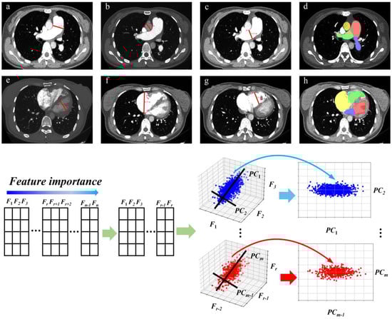 Some of the morphological features on CTPA are shown above. (a) Diameter of main pulmonary artery (MPAd), (b) diameter of ascending aorta (AAd), (c) diameter of right pulmonary artery (RPAd), (d) area of LPA (blue), RPA (green), MPA (red), and AA (yellow), (e) diameter of left ventricle, (f) diameter of right atrium, (g) diameter of right ventricle, (h) area of LV (red), RV (green), LA (blue), and RA (yellow). They were all assessed on transversal images in the diastole. The features extracted from the original CTPA images were first organized in a table, sorted by the Spearman’s rank correlation coefficient between one feature and mean pulmonary artery pressure. Since any two features we selected may contain a strong correlation, we removed redundant features by calculating the Pearson coefficient of all features with each other. Then we selected r features from all features we obtained. The considerately selected features were then normalized and feature dimension reduction was performed by principal component analysis. Finally, we chose m features for the regression and classification model.