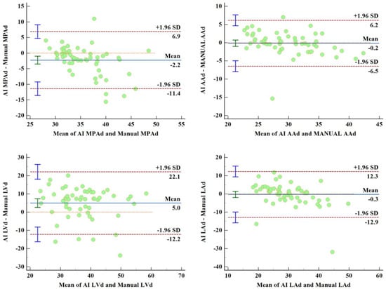 Table 3 shows that the differences in RPAd, AAd, RVd, and LAd measured by the manual measurement and the AI automatic measurement were not statistically significant (t = 1.222, p = 0.227; t = −0.347, p = 0.730; t = 0.484, p = 0.630; t = −0.320, p = 0.750, respectively). However, the results also suggest that the differences in MPAd, LPAd, LVd, and RAd measured by the manual the AI automatic measurements were statistically significant (t = −3.573, p = 0.001; t = 4.394, p < 0.001; t = 4.255, p < 0.001; t = −7.096, p < 0.001; respectively). Nevertheless, according to the correlation between these features and the PAP parameters, only LVd is valuable for regression and classification. Then, Bland–Altman analyses [] for features assessed by manual and AI automatic measurements were carried out, and the corresponding biases (limits of agreement) of MPAd, RPAd, LPAd, AAd, LVd, RVd, LAd, and RAd are −2.25 mm (−11.4 mm, 6.90 mm), 0.575 mm (−6.28 mm, 7.43 mm), 2.84 mm (−6.56 mm, 12.25 mm), −0.15 mm (−6.45 mm, 6.15 mm), 5 mm (−12.18 mm, 22.18 mm), 0.52 mm (−15.27 mm, 16.31 mm), −0.27 mm (−12.86 mm, 12.31 mm), and −11.68 mm (−35.83 mm, 12.46 mm), respectively. Figure 5 shows Bland–Altman analyses between manual and AI measurements.