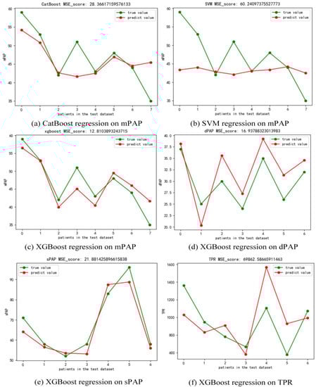 (a) CatBoost regression on mPAP (MSE = 28.37), (b) SVM regression on mPAP (MSE = 60.24), (c) XGBoost regression on mPAP (MSE = 12.82), (d) XGBoost regression on dPAP (MSE = 16.94), (e) XGBoost regression on sPAP (21.88), (f) XGBoost regression on TPR (MSE = 69,862.59).