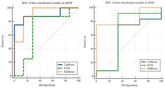 Area under the receiver operating characteristic curve (AUC) shows XGBoost model performs better than CatBoost and SVM model. The AUC of XGBoost model classification on mPAP and sPAP is 0.911 (p < 0.001) and 0.833 (p = 0.0057), respectively.