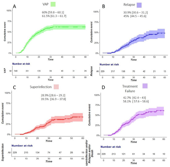 Cumulative incidence of ventilator-associated pneumonia (VAP) (A), relapse (B), superinfection (C), and treatment failure (D). The estimations at Day 30 and Day 60 are displayed for each respective outcome (% [95% confidence interval]).