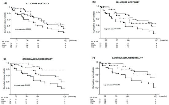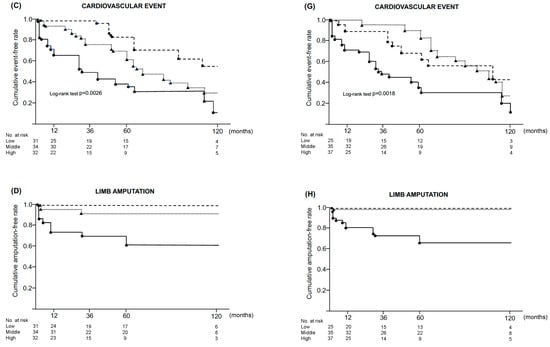 Stratified SFACS and BKACS significantly impacted cardiovascular mortality and cardiovascular events, respectively (Figure 1). The higher SFACS and BKACS groups showed significantly higher rates of cardiovascular mortality and events, respectively ((B), (C), (F), (G), p < 0.01). Stratified SFACS and BKACS showed borderline associations with all-cause mortality (although these were not statistically significant). Regarding limb amputation, the high SFACS and BKACS groups showed worse survival curves than the low SFACS and BKACS groups. However, because amputation was not performed in some groups (the low SFACS group and the low and middle BKACS groups) during the observation period, statistically significant differences were not observed in the life table analysis.