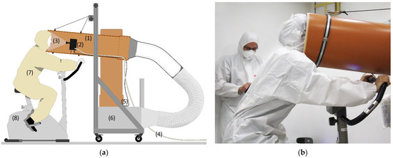 (a) The aerosol measurement setup in the lab: (1) PVC pipe, (2) optical particle sensor, (3) collection funnel, (4) plastic tubing to the vacuum pump, (5) data logger, (6) box with a HEPA filter, (7) test subject, and (8) cycle ergometer. (b) A test subject while measuring the aerosols emission rate.