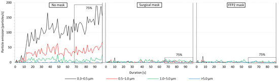 Figure 3 presents an example of the measured particles emitted from a 28-year-old male test subject. The emitted particles during the three investigated mask conditions cases are illustrated in the three sections of the diagram, each starting at the time the subject started training (t = 0 s). The boxes marked with 75% refer to the training time after reaching 75% of the maximum heart rate, which continued for 30 s before stopping the exercise. This 30 s time span was consistent in all the conducted aerosol measurements and was used to determine the average released particles. Figure 3 indicates a remarkable difference in the distribution of the emitted particles among the tested conditions. When exercising without a mask, a large amount of mostly 0.3–0.5 μm sized particles was emitted in addition to 0.5–1.0 and 1.0–5.0 µm particles. Larger particles with a size of >5 μm were almost at zero measured concentration. The increase in particles emission started almost immediately after the subject started training and continued to increase for about 30 s and continued to fluctuate until stopping the exercise. For the illustrated test subject, the emission rate of the 0.5–1.0 and 1.0–5.0 µm particles fluctuated steadily after reaching 75% of the maximum heart rate. The 0.3–0.5 µm particles, on the other hand, demonstrated two peaks at 93 and 98 s. When wearing the surgical mask, the emission of the smaller particles sized 0.3 to 5.0 µm was drastically decreased. Similar to exercising without a mask, the amount of the emitted particles with a size of >5 μm was near zero. When wearing the FFP2 mask, the measured particle emission was almost negligible for all particle sizes throughout the training period.