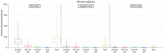 The results indicated a strong variation in the emitted particles among the 12 test subjects with a sum of all emitted particle sizes when wearing no mask ranging from 32.92 to 777.75 particles/s (mean = 203.25 particles/s). Due to a large difference in particle emissions between the female and male subjects, Figure 4 shows the mean measured particles from these two groups separately. The box plots show that the female subjects emitted significantly fewer particles than the male test persons during all investigated mask conditions. With no mask, the average sum of all emitted particle sizes from the female subjects was 90.87 particles/s (standard deviation (SD) = 48.60 particles/s) compared to 315.62 particles/s (SD = 218.52 particles/s) from the male subjects. Thus, the male subjects had an emission rate more than three times higher than the female subjects. The surgical mask reduced the emission rates for all particle diameters from the female test subjects by an average of 81.7% (with an emission rate ranging from 2.14 to 36.32 particles/s). This reduction rate of the surgical masks was even higher for male subjects with an emission reduction of 92.5% (with an emission rate ranging from 0.29 to 234.07 particles/s). The same trend was observed with FFP2 masks, in which the reduction rate of all emitted particles was 85.3% and 97.3% for female and male subjects, respectively (with an emission rate of 1.41 to 15.99 particles/s and 0.92 to 51.05 particles/s for female and male subjects, respectively). The measured particle emission rates with FFP2 masks were, however, fairly low and can be attributed to measurement uncertainties related to the presence of particles in the room air with a concentration higher than the calculated average background concentration.