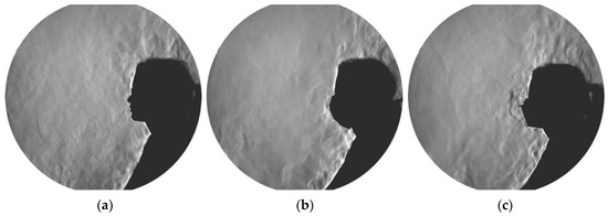 Schlieren images of a female test subject when wearing no mask (a), surgical mask (b), and FFP2 mask (c). The corresponding videos of these images are available in the Supplementary Materials (Videos S1, S2, and S3).