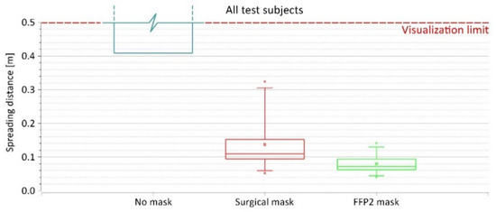 When considering all test subjects as one group, similar patterns related to the spreading distances can be observed (Figure 8). In this case, the larger variety of spreading distances occurred when wearing the surgical mask, with the distance ranging between 0.05 and 0.32 m, average = 0.14 m, and SD = 0.08 m. With the FFP2 mask, the spreading distance from all test subjects ranged between 0.04 and 0.14 m with an average of 0.08 m and an SD of 0.03 m.