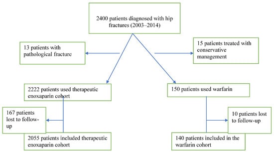 We performed a retrospective review of prospectively collected data from 2003–2014 in a single center to determine the patients who received therapeutic warfarin anticoagulation, and the patients who received therapeutic enoxaparin before surgery. The inclusion criteria included: (1) diagnosis of femoral neck fracture via surgical route and (2) minimum follow-up of 24 months. The exclusion criteria included: (1) non-operative hip fracture; (2) contraindications for anticoagulation use, including bleeding abnormalities, malignant hypertension, or advanced retinopathy; and (3) patients who were diagnosed with pathological fractures (Figure 1). The study was approved by the local institutional review board as part of several different studies done on the same population [14].