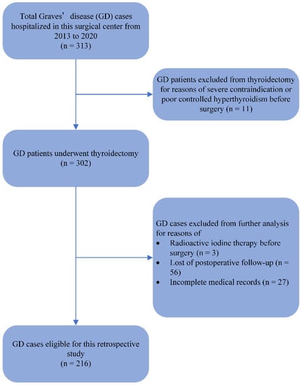The medical records of patients from 2013 to 2020 who had hyperthyroidism and underwent a thyroidectomy at this high-volume center—where over 1000 thyroidectomies are performed per year—were reviewed in detail. Only patients with hyperthyroidism caused by GD were involved in this study. Those who were lost to postoperative follow-up, with incomplete medical records or who had been previously treated with RAI were excluded. A total of 216 patients were eligible for the retrospective analysis (Figure 1). The patient characteristics, clinical data, surgical outcomes, postoperative complications and follow-up results were collected. The study was approved by the medical ethics review committee of Shanghai Ruijin Hospital.