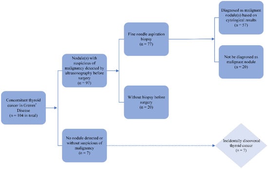 - Papanastasiou, A.; Sapalidis, K.; Goulis, D.G.; Michalopoulos, N.; Mareti, E.; Mantalovas, S.; Kesisoglou, I. Thyroid nodules as a risk factor for thyroid cancer in patients with Graves’ disease: A systematic review and meta-analysis of observational studies in surgically treated patients. Clin. Endocrinol. 2019, 91, 571–577. [Google Scholar] [CrossRef]