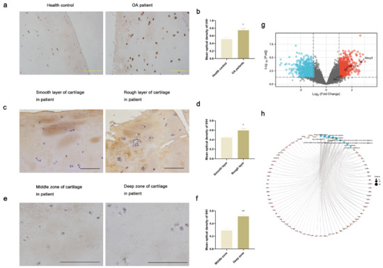 The super layer of articular cartilage was undamaged and smooth in the healthy controls, while it was damaged and appeared rough in the OA patients. The smooth and rough cartilage layers coexisted in the same patient, reflecting the cartilage being undamaged and damaged respectively [25]. The results of IHC in the articular cartilage of OA patients and healthy individuals revealed that the IHH expression level was significantly higher in damaged cartilage compared with undamaged cartilage (Figure 1a–d). Moreover, the IHH expression level was significantly elevated in the deep zone cartilage as compared to that in the middle zone cartilage (Figure 1e,f). In the deep zone articular cartilage tissues, most of the chondrocytes were in the state of terminated hypertrophy [31].