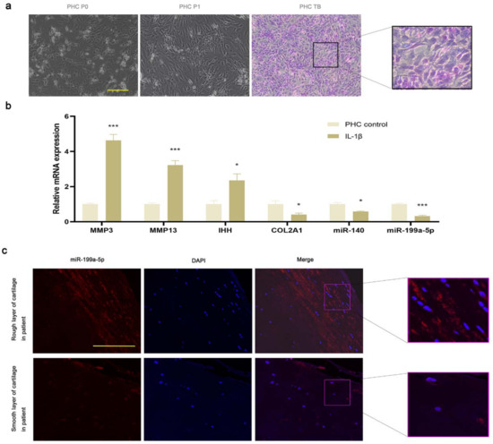 The human articular chondrocytes were spindle-shaped and showed positive results in the toluidine blue staining (Figure 2a). The IL-1β-induced PHCs showed a significant increase in the expression levels of MMP3 and MMP13 and a significant decrease in the COL2A1 level as compared to the control group, suggesting the successful induction of the OA model. The expression level of OA-associated miR-140 was lower in the IL-1β-induced PHCs as compared to the control group; these results were consistent with the previous study [32]. The IHH expression level was significantly higher in the OA cells as compared to the control group, while that of miR-199a-5p was significantly lower (Figure 2b). In the damaged cartilage tissues as compared to the undamaged cartilage tissues, the expression level of miR-199a-5p detected using FISH was lower (Figure 2c).