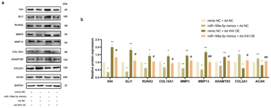The ad-IHH was transfected into the PHCs for upregulating the IHH expression. As shown in Figure 4a,b, the co-transfection of ad-NC and miR-199a-5p mimics significantly decreased the IHH expression level as compared to that in the cells co-transfected with ad-NC and mimic NC. This decrease in the IHH expression was restored by the overexpression of IHH and miR-199a-5p reversed the overexpression. Meanwhile, miR-199a-5p could significantly decrease the GLI1 expression and the decrease of GLI1 expression was restored by IHH overexpression, suggesting that miR-199a-5p could inhibit the GLI1 expression by regulating the IHH. Gli1 could activate the Runx2 expression and promote chondrocyte hypertrophy [33]. In this study, the protein expression trend of RUNX2 and COL10A1, associated with the chondrocyte hypertrophy, was consistent with that of the IHH and GLI1 in PHCs, suggesting that miR-199a-5p could regulate the IHH signal pathway and chondrocyte hypertrophy. Furthermore, miR-199a-5p decreased the expression levels of catabolic extracellular matrix proteins, including MMP3, MMP13, and ADAMTS5, which were then restored by the IHH overexpression, while the expression levels of anabolic extracellular matrix proteins, including COL2A1 and ACAN showed opposite effects.