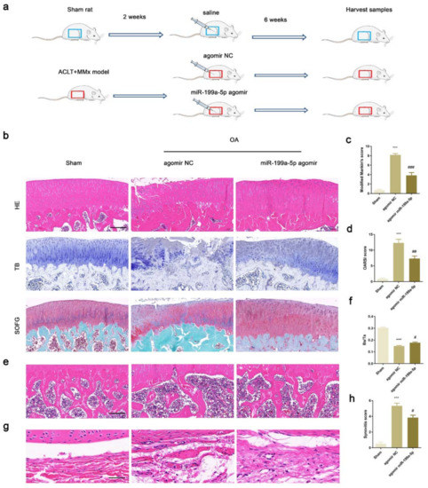 Intra-articular injection of miR-199a-5p attenuated OA progression in rats. (a) Flowchart of the experiment. (b) HE, TB, and SOFG staining of the articular cartilage tissues in rats. (c,d) Modified Mankin’s score and OARSI analysis in rats. (e) HE staining of subchondral bone. (f) The statistical ratio of bone area to the tissue area in the OA rats. (g) HE staining of the synovium. (h) Synovitis score in rats. Scale bar represents 200 μm. HE, hematoxylin, and eosin; TB, toluidine blue; SOFG, Safranin O and fast green. Scale bar represents 100 μm. (*** p < 0.001 versus sham group; # p < 0.05, ## p < 0.01, ### p < 0.001 versus agomir NC group; n = 6 for each group).
