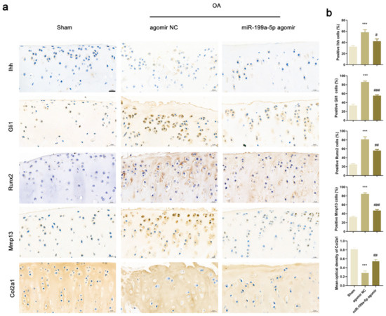 Immunohistochemical staining was performed to identify the expression levels of genes associated with the Ihh pathway and matrix degradation (Figure 6a). The protein levels of Ihh, Gli1, Runx2, and Mmp13 were higher in the OA rats of the agomir NC group as compared to those in the sham group rats. Similarly, the percentage of Ihh, Gli1, Runx2, and Mmp13-positive articular chondrocytes significantly increased in the OA rats (Figure 6b). Conversely, the expression trend and mean optical density of Col2a1 were significantly lower in the OA rats of the agomir NC group as compared to those in the sham group. The expression and proportion of the positive cells in articular cartilage tissues of OA rats intra-articularly injected with miR-199a-5p agomir were reversed as compared to those injected with agomir NC, suggesting that miR-199a-5p could inhibit matrix degradation by regulating the Ihh signal pathway.