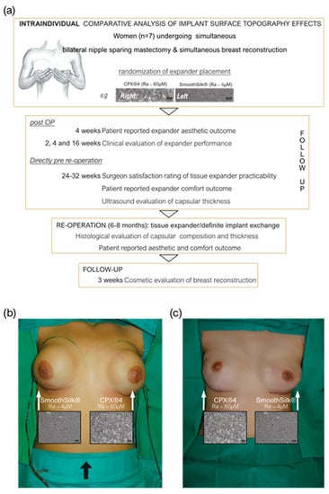 Expander immunology Trial (ClinicalTrials.gov ID: NCT05648929. (a) Assessment schedule pre- and after-expander implantation. (b,c) Standardized intra-operative photo documentation of an intra-individual comparative bilateral tissue expander-based breast reconstruction. Each patient received both types of expanders, the routinely used CPX®4 breast expanders (MENTOR®, USA: surface roughness: ~60 µM Ra) and the novel surface-roughness reduced SmoothSilk® breast expanders (Motiva Flora®, Establishment Labs, Costa Rica: surface roughness: ~4 µM Ra) randomized to the left or right breast in combination with TiLOOP® pocket mesh after bilateral prophylactic NSME. (b) Patient 003; Right: SmoothSilk®, Left: CPX®4, (c) Patient 001; Right: CPX®4, Left: SmoothSilk®.