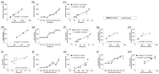 As presented in Figure 2, the mastectomy weight of the left and right breast correlated bilaterally with high significance in all 7 subjects (Figure 2a, *** p = 0.005). Moreover, the mastectomy weight of both breasts correlated and increased in dependence with BMI (Figure 2b, right breast: *** p = 0.0002, left breast: ** p = 0.006). Postoperatively, the tissue expander intermediate expansion volume correlated bilaterally, but also with BMI as well as the weight of the mastectomized breast, in a simple regression, respectively. The final implant reconstruction volume correlated bilaterally with the mastectomy weight as well as with the intermediate expander volume, but not to BMI (Figure 2e,f).