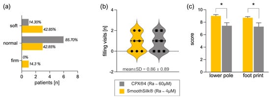 Intra–individual clinical evaluation of tissue expander performance after bilateral tissue expander-based breast reconstruction. Each patient received both types of expanders, the routinely used CPX®4 breast expanders (MENTOR®, USA: surface roughness: ~60 µM Ra) and the novel surface-roughness reduced SmoothSilk® breast expanders (Motiva Flora®, Establishment Labs, Costa Rica: surface roughness: ~4 µM Ra) randomized to the left or right breast after bilateral prophylactic NSME. (a) Evaluation of expander palpation 2 W, 4 W, and 16 W post-op. (b) Number of filling visits performed to full expansion of the device. (c) Surgeon satisfaction rating of tissue expander practicability 6–8 months post-op (lower pole: p * = 0.023, footprint: * p = 0.043; n = 7). Mean values ± SD of seven biological replicates (patients) are shown. The level for statistical significance was set at pns > 0.05, * p < 0.05, ** p < 0.002, *** p < 0.0002, and **** p < 0.0001, for all statistical tests (inter- and intra-individual comparison; n = 7).