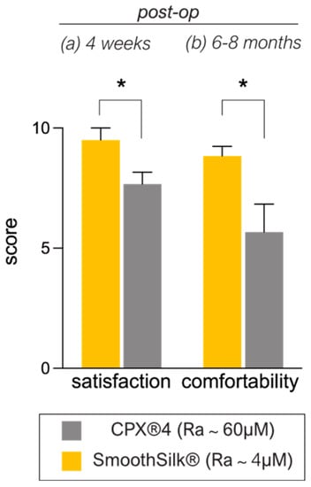 The rating of expander comfortability after total expansion time, right before the exchange to definite implants, indicated a mean value of 8.85 (±0.90) for the SmoothSilk® breast expander and 6.00 (±2.77) for the rougher CPX®4 device. Hence, both patient-reported aesthetic and comfort outcome were significantly higher rated for the SmoothSilk® breast expander (Figure 4; satisfaction after 4 weeks: p * = 0.036; comfortability after 6–8 M: p * = 0.036).