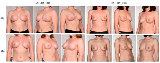Photo documentation for cosmetic evaluation after the (a) first (PAT001_004 and PAT001_006; left breast: Mentor®CPX4, right breast: SmoothSilk®) and (b) second reconstructive stage (PAT001_004: Motiva Ergonomics SmoothSilk®, 450 cc, full projection, and PAT001_006: Motiva Ergonomics SmoothSilk®, 340 cc implants, demi).